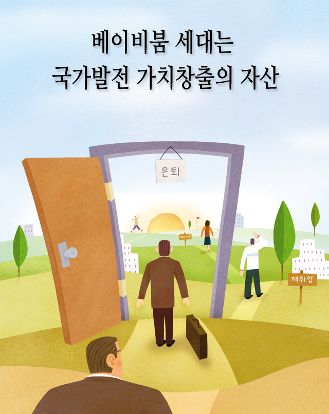 7백13만 명에 달하는 베이비붐 세대의 퇴직이 시작됐다. 기존의 노년층과는 다른 ‘뉴시니어층’인 이들은 앞으로도 더 오랜 기간 일할 수 있는 건강과 실무 경험을 겸비하고 있는 인적 자원이다. 베이비붐 세대의 은퇴가 노후 준비 부족으로 국가적, 사회적 재앙이 되지 않도록 해야 한다. 재취업, 신세대 멘토, 재능기부 등으로 베이비붐 세대는 지속적인 사회 기여를 해야 하며 연금, 역모기지, 건강 관리 등 이들 세대를 위한 사회적 지원도 필요하다. 은퇴는 새로운 출발이 될 수도 있기 때문이다. |