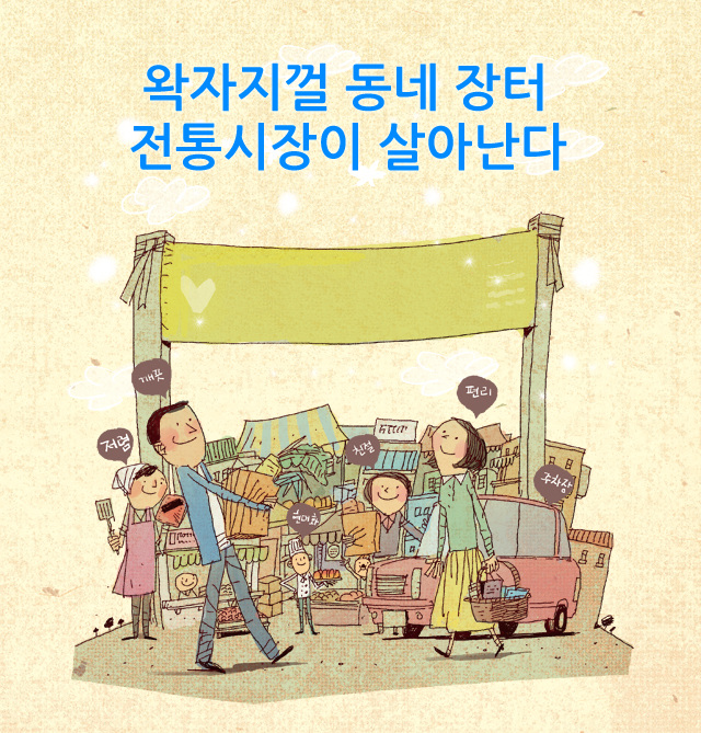 역사적으로 시장은 서민경제와 지역경제를 살리는 한 축이자 소통의 장(場)이었다. 흥정과 거래로 왁자지껄했던 장터가 새로운 유통구조의 출현과 소비행태의 변화로 위기에 처하자 정부가 다양한 지원책으로 전통시장 살리기에 온 힘을 쏟고 있다. 경쟁력 강화를 위해 질 좋은 농수산물을 저렴하게 공급하고, 편리한 쇼핑을 위해 상가와 주차시설 등을 현대화하고 있다. 공동마케팅과 상인조직 역량 강화 등 경영방식의 선진화로 자생력도 키우고 있다. 젊은 피를 수혈, 젊은 고객을 유치하면서 청년실업까지 해결하는 프로젝트도 가동 중이다. 전통시장이 깨끗하고 친절하면서 다양한 문화가 숨 쉬는 공간으로 변신, 활기를 되찾아가고 있다. |